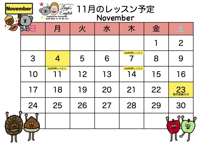 学芸会、代休など秋の行事が多い時期です。わかっている場合は早めのご連絡お願いします。