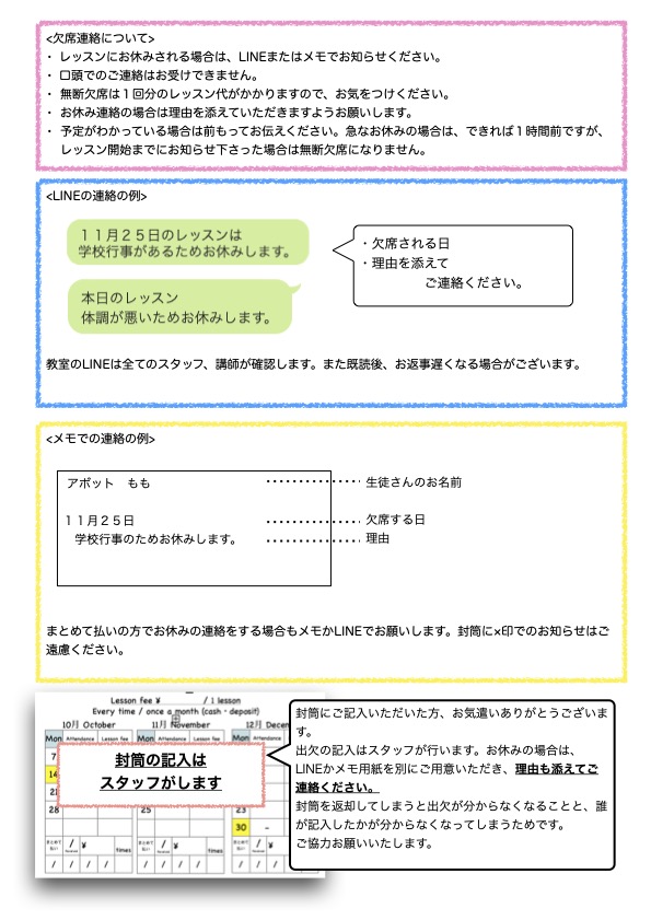 無断欠席は1回分のレッスン代がかかりますので、お気をつけください。