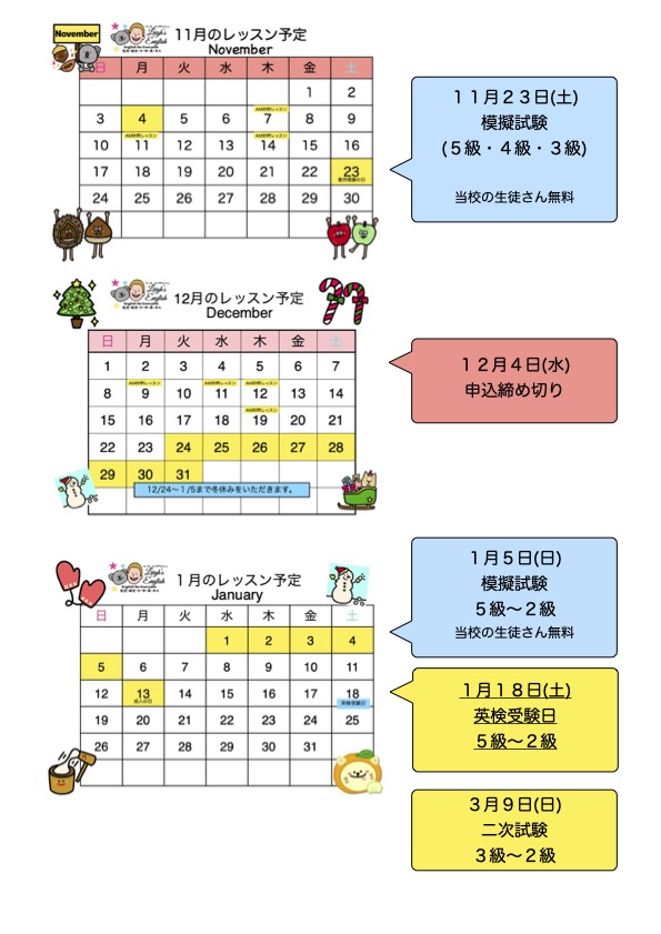 ご希望の方は、11月18日(月)までにLINEメッセージにてお知らせください。今回初めて受ける方はもちろん、2025年第一回に受験を予定している方も是非ご参加ください。当校の生徒さんは無料です。ご家族、ご友人、一般受験の方は今回から模擬試験は500円いただきます。