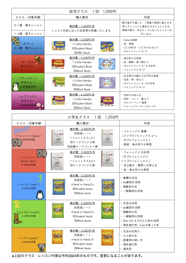 曜日によって、時間は変わらず教科書のみ変わるクラスと、新たにクラスを作る関係で時間が変わる曜日がございます。ご都合を伺うことがあるかと思いますがよろしくお願いいたします。