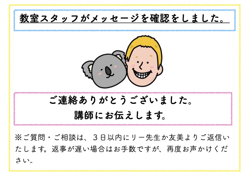 ご質問、ご相談については、リー先生または友美が3日以内に追ってご連絡させていただきます。返信が遅い場合は、見過ごしていることがありますので、お手数ですが、再度ご連絡お願いいたします。