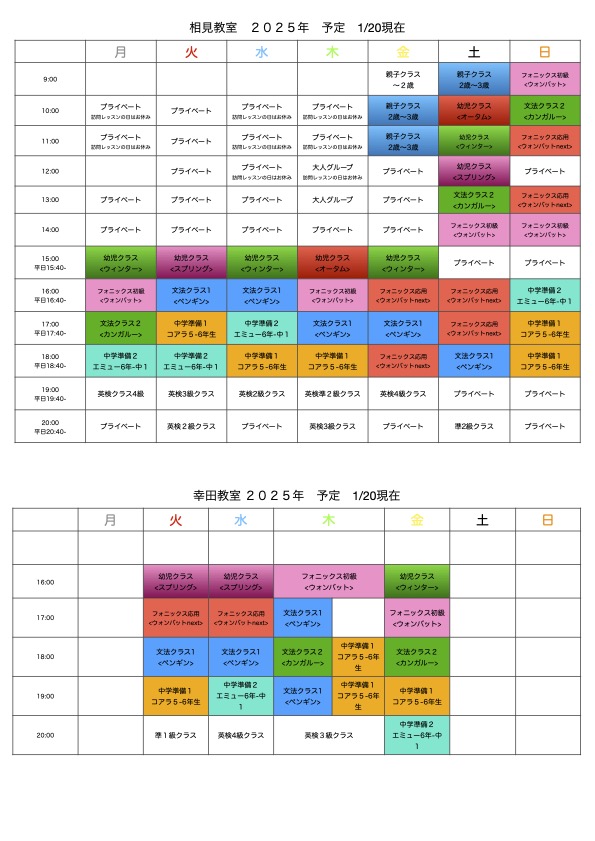 以下、2025年4月からのスケジュール予定です。幸田教室は新たに金曜日にクラスを増やす予定です。