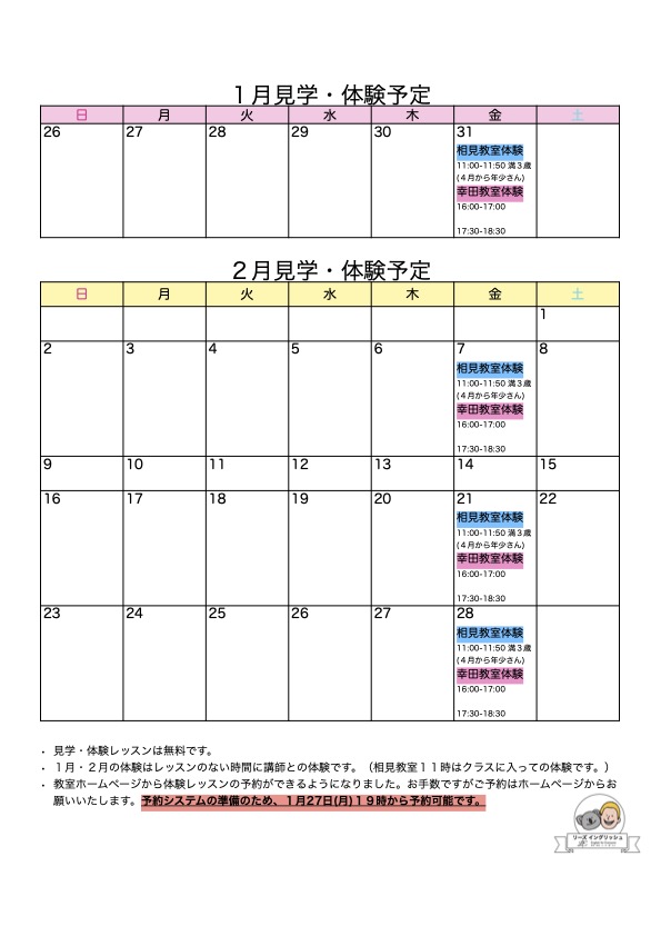 ご家族の方の体験レッスンを以下のように予定しています。ご希望ございましたら、明日、1月27日(月)19時以降にホームページからご予約できますので、よろしければご検討ください。