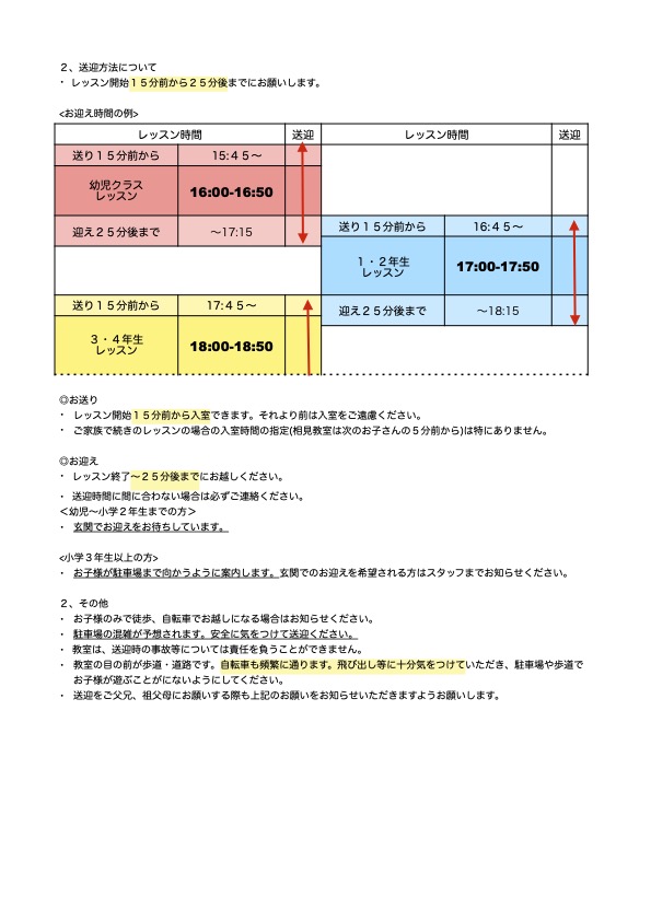 また、お迎えの時間についてはレッスン終了後から25分後までに変更しました。混雑する時間を避けていただけますと助かります。