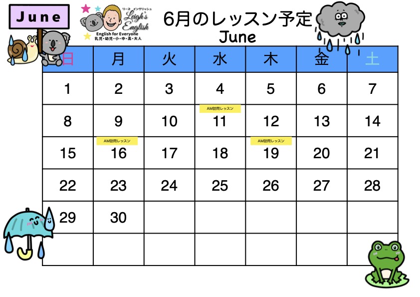 6月のレッスン予定は以下の画像の通りです。日曜日と月曜日は5週ありますが、レッスンを予定しています。(年間でレッスン回数を合わせているため)ご予定ご確認ください。