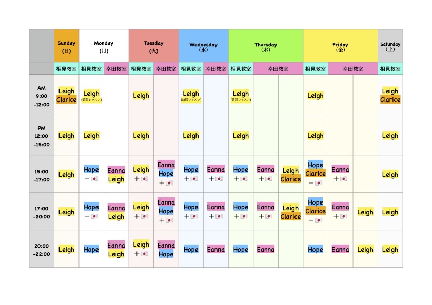また、この日はリー先生が試験官で英検へ参加するため、相見教室のレッスンを、クラリス先生、ヤナ先生、ホープ先生が担当します。