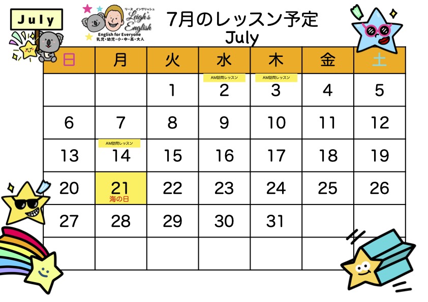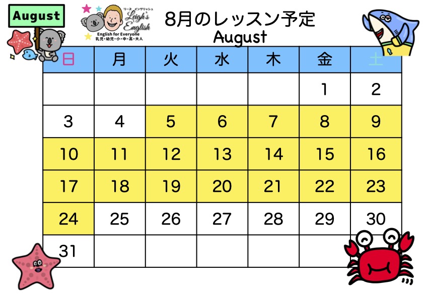 いつも英語学習のためのお時間を作っていただき感謝いたします。8月レッスンについてお知らせいたします。