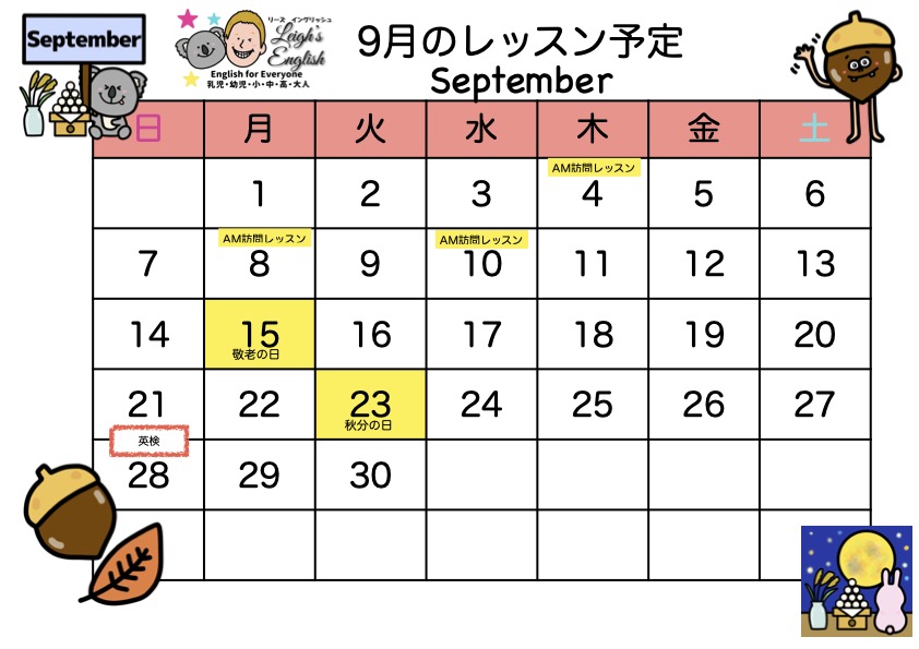 8月、9月のレッスン予定については以下の通りです。8月は5日〜24日まで長いお休みをいただきます。