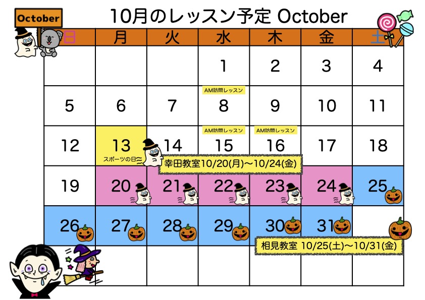 黄色はお休みです。(ピンク・水色はハロウィーンレッスンです。詳細は↓へ)