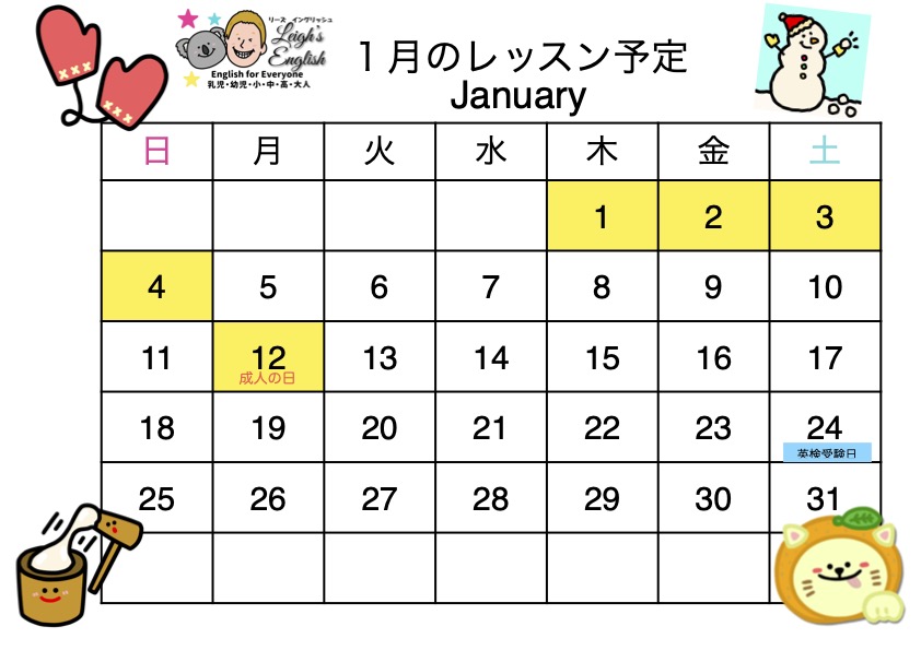 1月の午前の訪問レッスンの予定はまだ決まっていません。決まり次第配信メッセージお送りいたします。