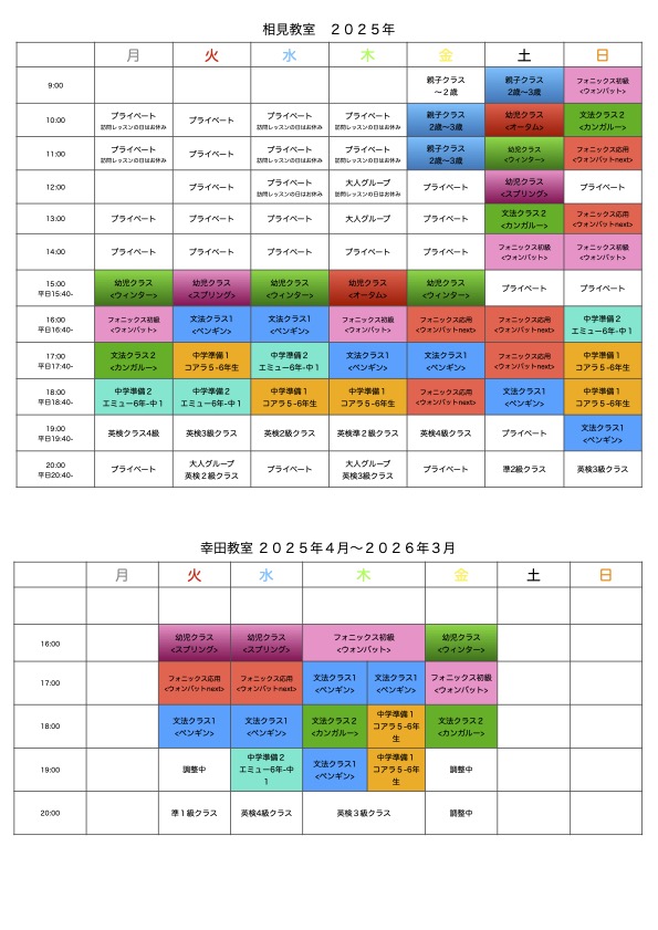 2025年4月〜2026年3月までのクラスのスケジュールです。PDFファイルはこちら